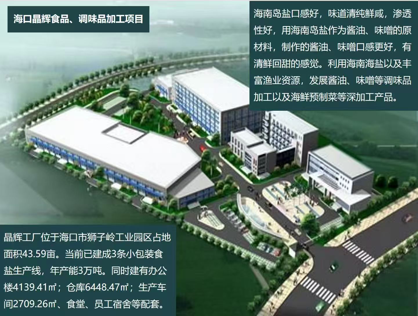 海南晶辉盐业有限公司于2007年12月发起成立,注册资本1500万元,地址位于海南省海口市狮子岭工业园区,属于海南省AAA级信用国企—海南控股集团成员企业。公司自有工业用地总面积29078.43㎡,当前已建设有办公用房约4490.22㎡、厂房仓库约9157.43㎡,总建筑面积13647.95㎡。厂区原规划建设面积30350.7㎡,未来发展空间充足。