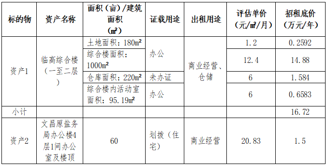 为了持续实现资产营收,现将我司文昌资产及下属盐业公司临高资产共计0.27亩,3处房屋共计1375.19m²对外公开招租。具体公开招租招租内容如下: