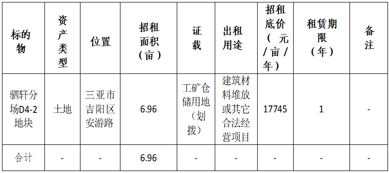 为提升资产运营效率,增加收益,现将三亚市吉阳区安游路驷轩分场D4-2地块土地对外公开招租,土地面积为4640.02㎡(6.96亩)。具体招租方案如下: